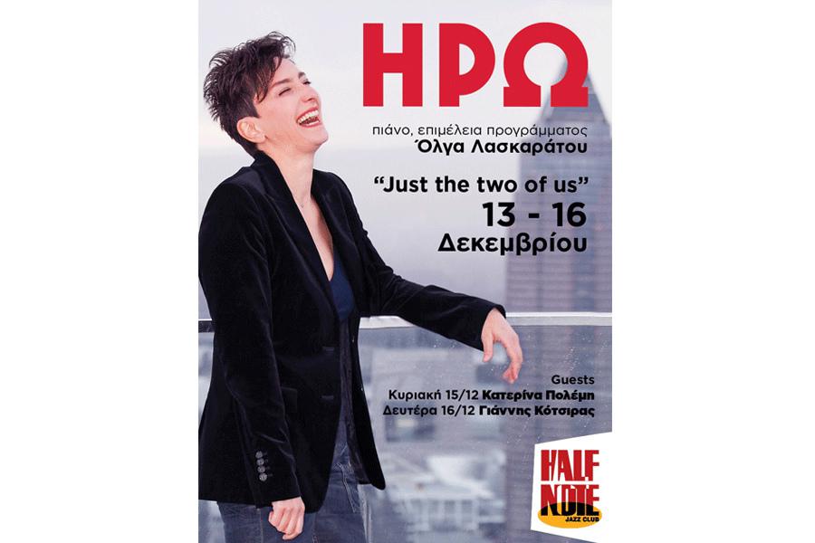 Η Ηρώ συναντιέται ξανά, μετά από δυο εξαιρετικά πετυχημένες σεζόν, στη σκηνή του Half Note Jazz Club με την Όλγα Λασκαράτου, πιανίστρια με κλασική παιδεία και ραδιοφωνική παραγωγό που έχει και την επιμέλεια του προγράμματος. Οι δυο τους, μόνες με δυο πιάνα επί σκηνής – αλλά και με καλεσμένους που θα αποτελέσουν έκπληξη – παρουσιάζουν για τέσσερα βράδια ένα πρόγραμμα γεμάτο με αισθήματα και συναισθήματα, με καλλιτεχνική και ερμηνευτική δεξιοτεχνία και τραγούδια από όλο τον κόσμο, διαχρονικά και καταγραμμένα στην κοινή μας συνείδηση. Στόχος των δύο καλλιτέχνιδων είναι να δώσουν ένα όμορφο στίγμα από διάφορα είδη μουσικής, που μπορούν να συνυπάρχουν δημιουργικά, εκφράζοντας το κοινό αίσθημα.